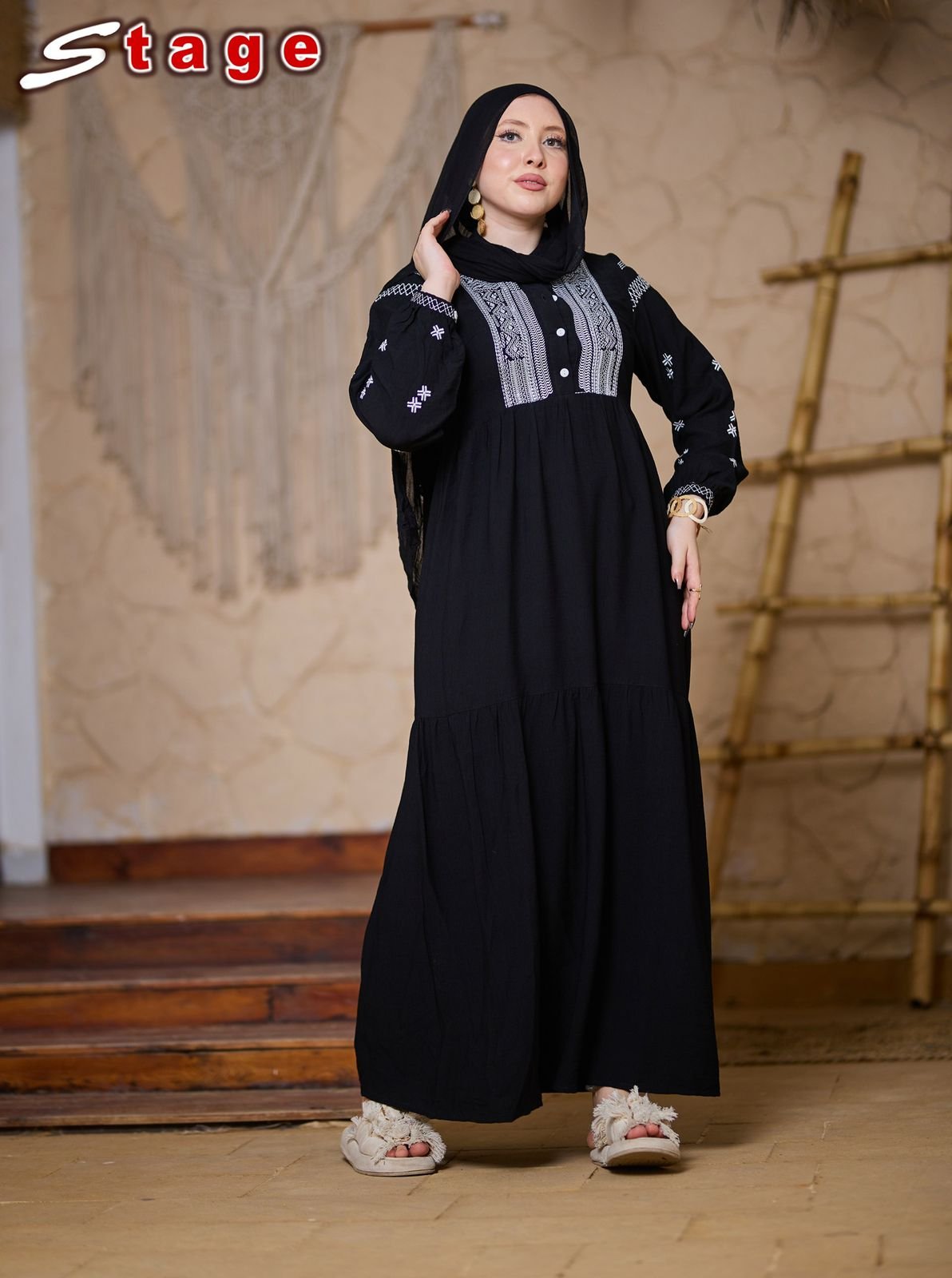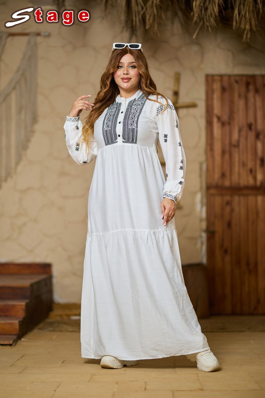 فستان تطريز علي الكم والصدر مصنوع من خامه الكتان المعالج ضد الانكماش